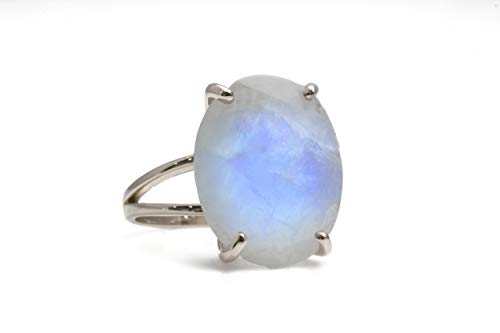 Be captivated by the charming beauty of this Moonstone jewelry ring gorgeously crafted with 925 Sterling silver prongs and band. Moonstone measures 16x20mm. Stunning iridescence highlight this June birthstone ring. Can be worn as a solo statement ring or a boho ring and stacked with other pieces.