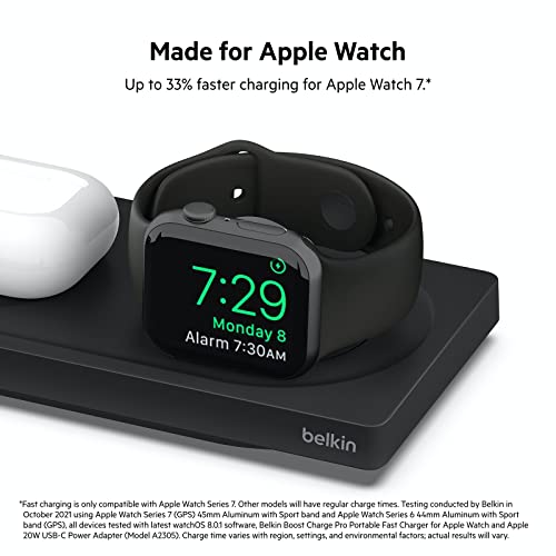 *Fast charging is only compatible with Apple Watch Series 7. Other models will have regular charge times. Testing conducted by Belkin in October 2021 using Apple Watch Series 7 (GPS) 45mm Aluminum with Sport band and Apple Watch Series 6 44mm Aluminum with Sport band (GPS), all devices tested with latest watchOS 8.0.1 software, Belkin Boost Charge Pro Portable Fast Charger for Apple Watch and Apple 20W USB-C Power Adapter (Model A2305). Charge time varies with region, settings, and environmental factors; actual results will vary.