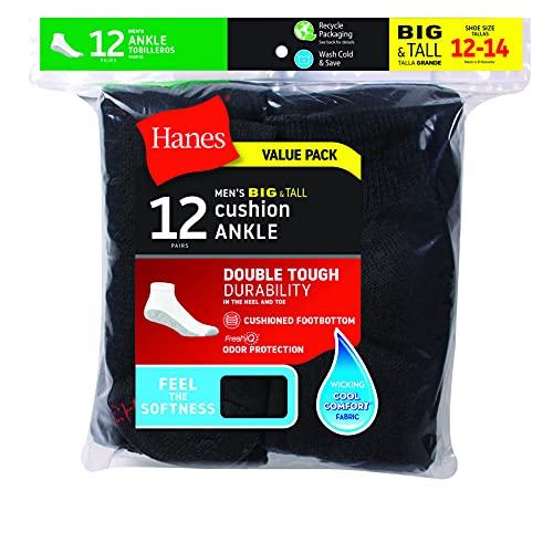 Hanes Double Tough B&T 12-Pack Ankle socks pack a powerful punch with double tough durability and maximum cushioning around the foot for ultimate comfort. Wicking Cool Comfort® Fabric will help keep your feet cool and dry. Our FreshIQ® Advanced Odor Protection will help fight those stinky feet! Spandex and Comfort Toe Seam will provide comfort and a better fit. Fits Men’s shoe size 12-14.