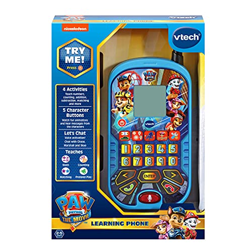 PAW Patrol, let’s roll! Call Chase, Marshall and Skye on the PAW Patrol – The Movie: Learning Phone. Engage your young pups with imaginary play and learning with four games and six activities. Help rescue Chase by finding the matching shadow in the Finding Chase game. Oh, no! Can you save the town’s fireworks display in Falling Fireworks? Type the correct number as fast as you can! Take a walk across the street with Marshall in the Count in the City game and count the number of cars that go by. It’s time to team up with Skye. Add and subtract numbers to help her stop the Cloud Catcher from making bad weather for Adventure City! Voice activation lets kids chat with Chase, Marshall and Skye to role-play all kinds of adventures with the PAW Patrol. Use the five character buttons to hear voice messages from Chase, Marshall and Skye and watch animations of Chase, Marshall, Skye, Liberty and Rubble. Take learning and adventure on the go with this pretend phone! Intended for ages 2–5 years. Requires 2 AAA batteries. Batteries included for demo purposes only. New batteries recommended for regular use.